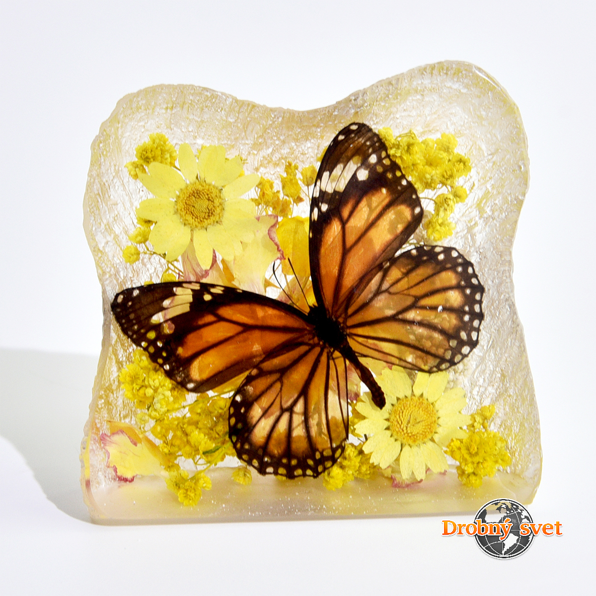 Originálne akrylové ťažítko s pravým motýľom na žltých kvetoch je jedinečný prírodný exemplár, ktorý zaujme svojím výzorom, nakoľko zadná strana ťažítka pripomína ľad.