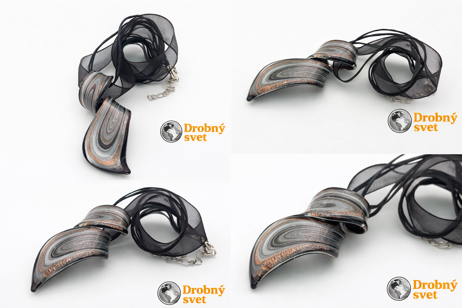 Rozmer prívesku 3,5 x 6 cm. Náhrdelník viacradový so stužkou z organzy, zapínanie bižutérnou karabínkou.